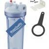 Suporte para Filtro BigBlue de 10″ ou de 20″ de altura, construído em aço com pintura epóxi branca em chapa de 3mm com furos para fixação na parede e no filtro e espaço para a válvula de alivio.