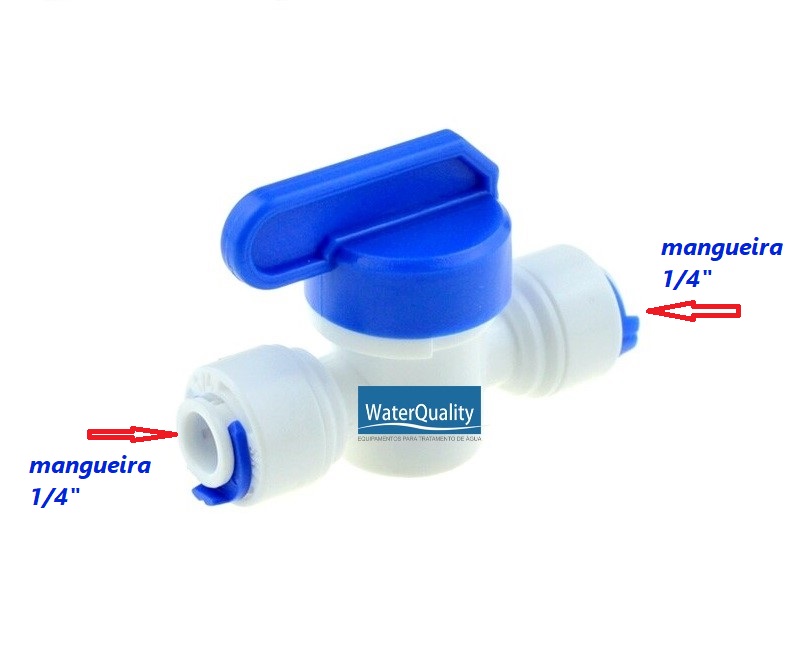 Válvula esfera inline reta para mangueira de 1/4″, com encaixe rápido para filtros de água e sistemas de osmose reversa.